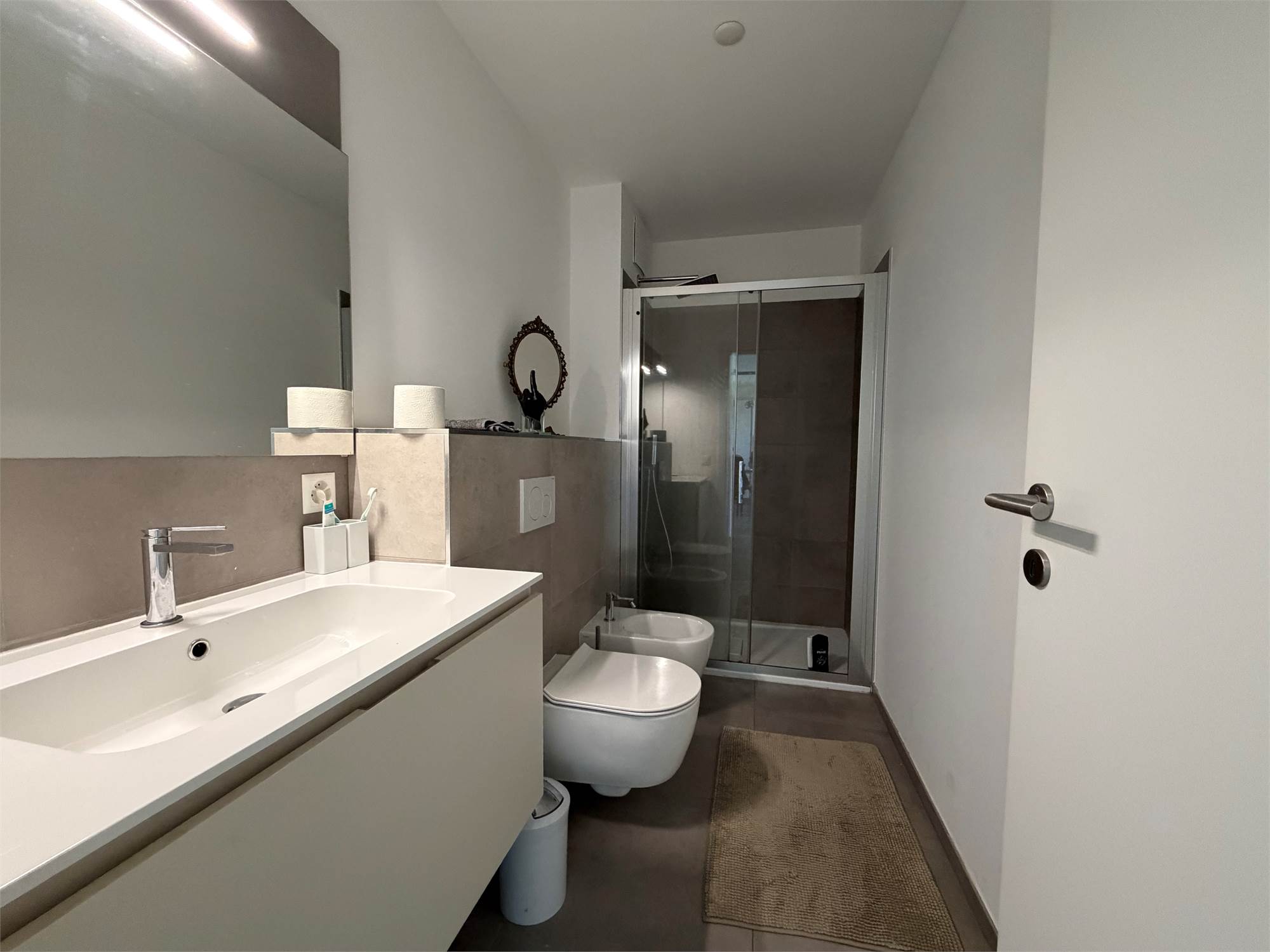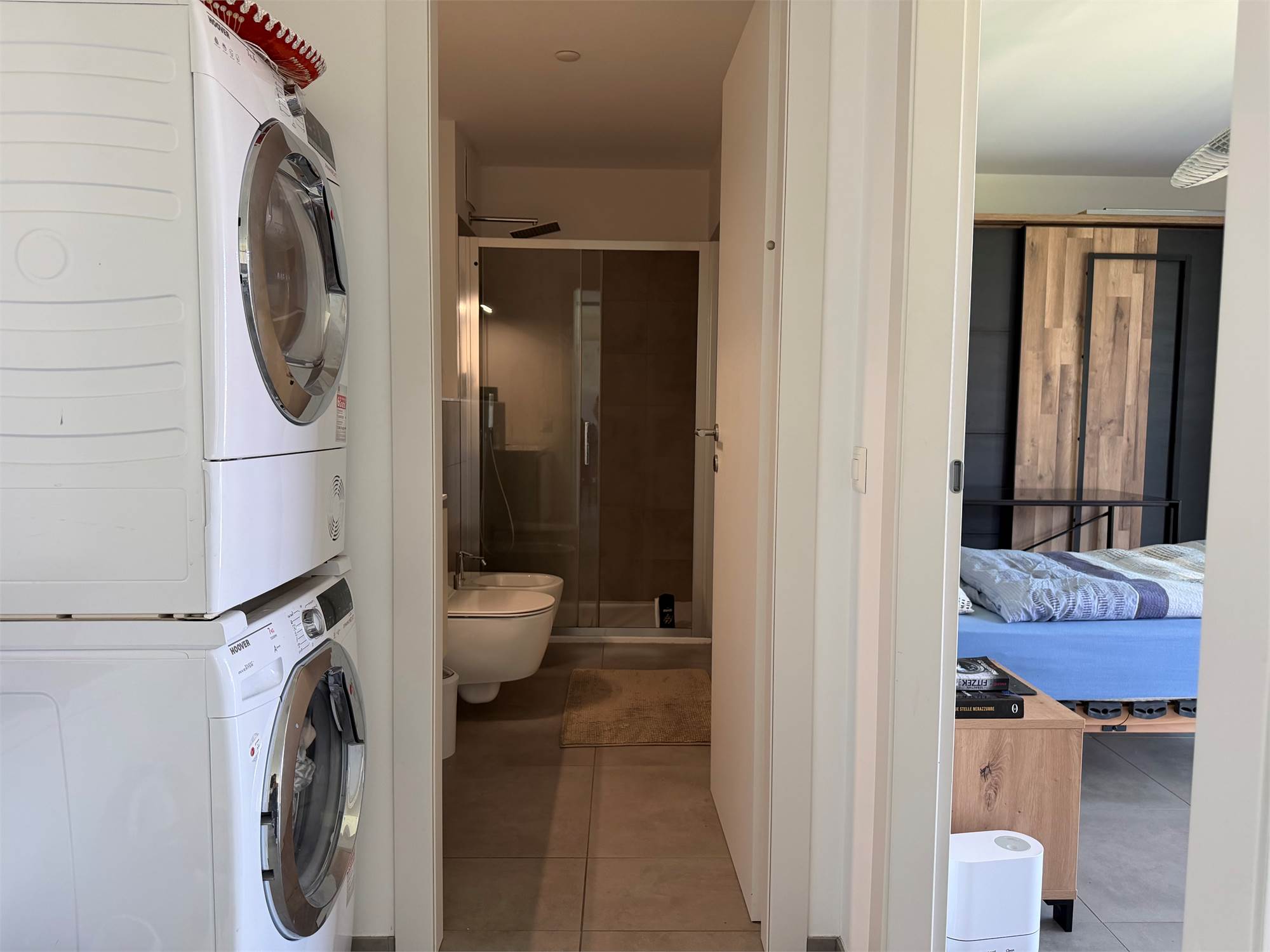 Die Wohnung verfügt über einen einladenden Eingangsbereich, ein Wohnzimmer mit offener Küche, ideal zum Zusammensein, einen Flur mit Platz für einen Garderobenschrank, ein Schlafzimmer und ein modernes Bad. Die Terrasse von fast 17 m² erweitert den Wohnraum und bietet einen praktischen Abstellraum.