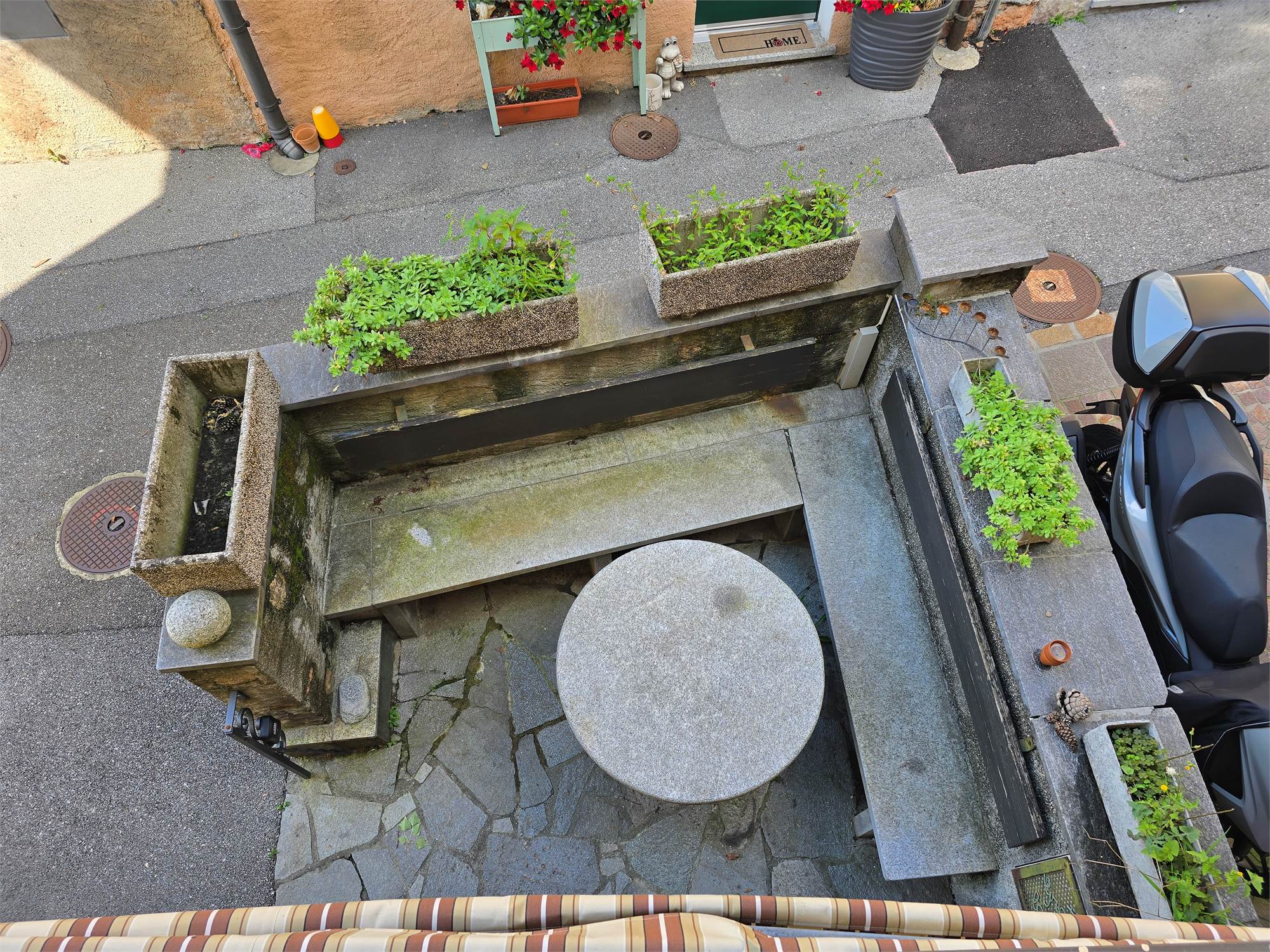 Esterni: patio privato con tavolo e panche in cemento, perfetto per i momenti di relax.