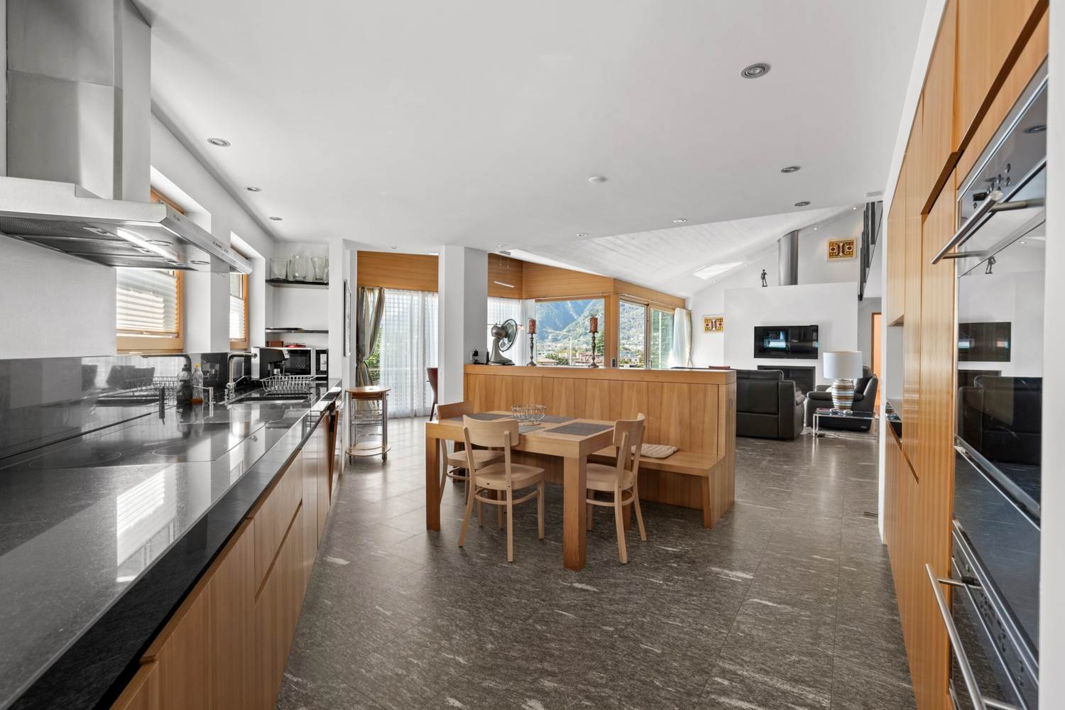 Finiture di pregio: granito della Val Calanca (sasso unico), cemento a vista, muri in pietra da 30 cm con isolamento da 18 cm