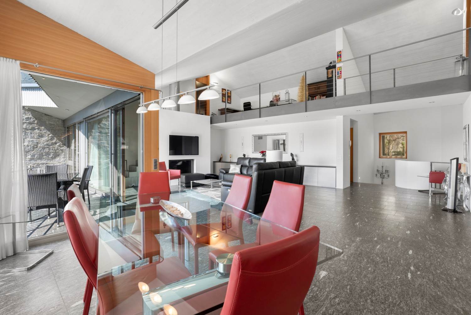 Ampio soggiorno con camino e accesso a grande terrazza panoramica